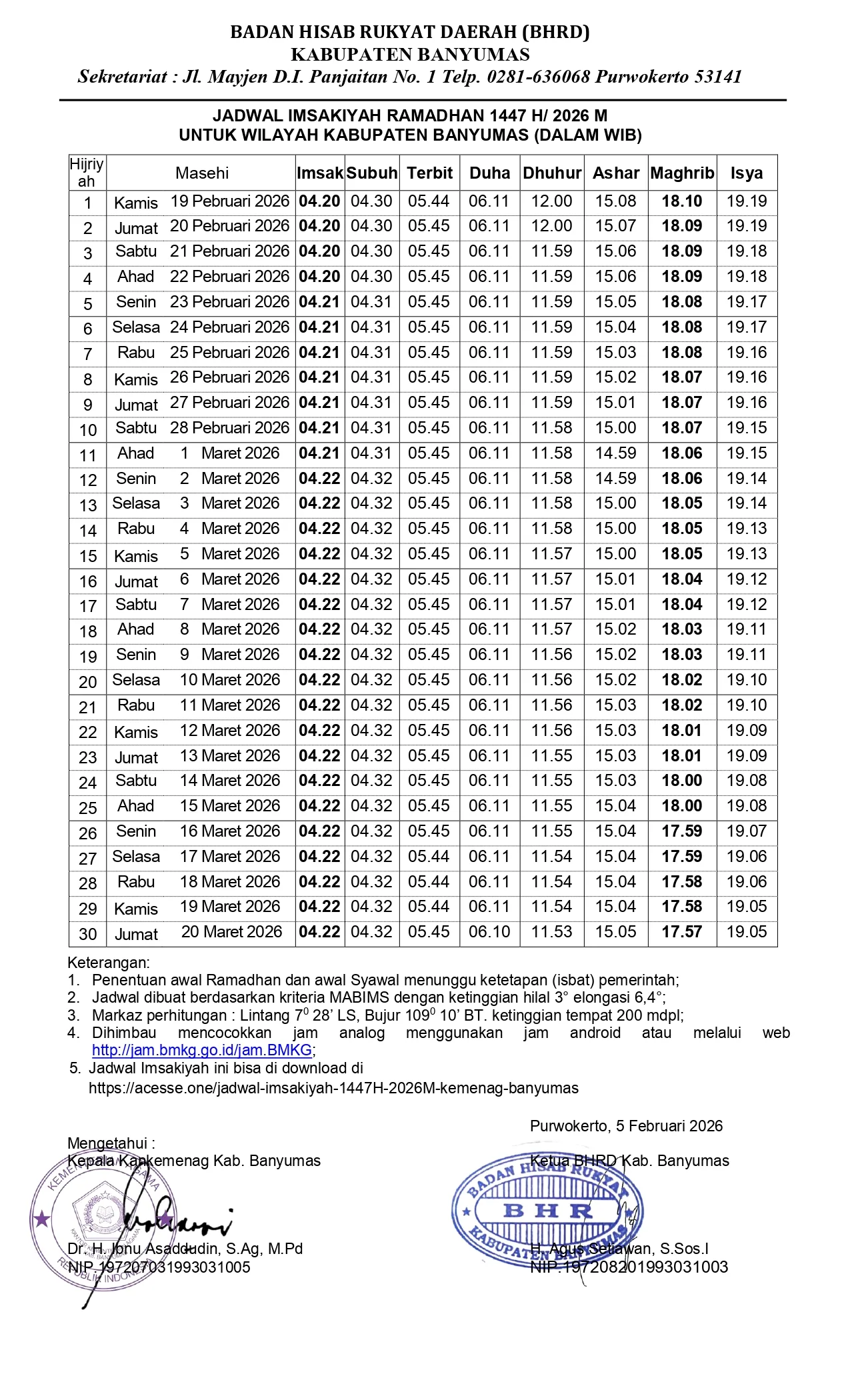 Jadwal Imsakiyah Ramadhan 1447 H/2026 M ini diterbitkan secara resmi oleh Badan Hisab Rukyat Daerah Kabupaten Banyumas yang beralamat di Jalan Mayjen D.I. Panjaitan No. 1 Purwokerto. Dokumen tersebut diketahui dan disahkan oleh Kepala Kantor Kementerian Agama Kabupaten Banyumas, Dr. H. Ibnu Asaddudin, S.Ag., M.Pd., serta Ketua BHRD Kabupaten Banyumas, H. Agus Setiawan, S.Sos.I.