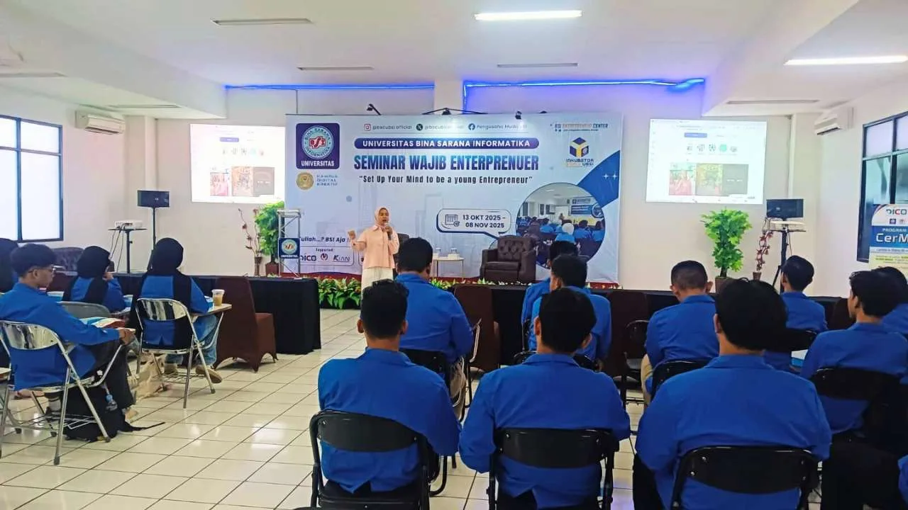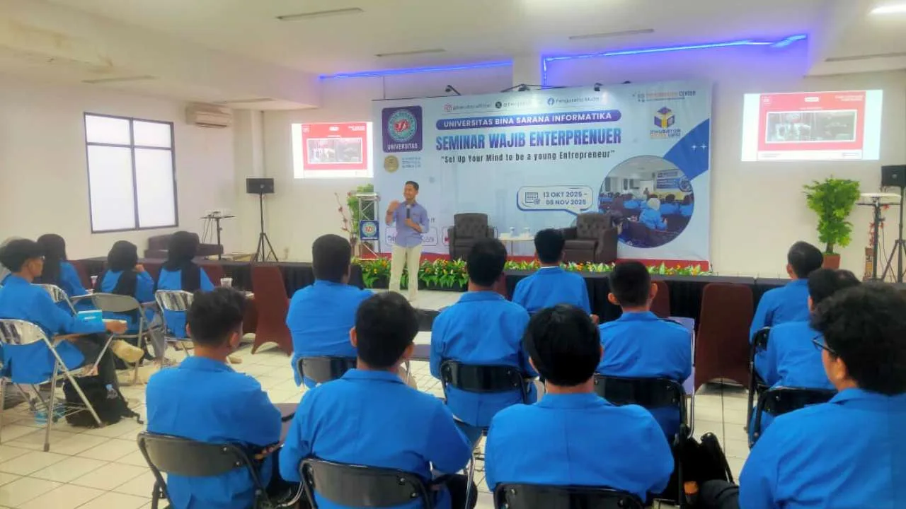 PurwokertoHitz.com – Universitas Bina Sarana Informatika Kampus Purwokerto kembali menggelar kegiatan Seminar Wajib Entrepreneur yang menjadi bagian dari program pengembangan karakter mahasiswa di bidang kewirausahaan. Acara ini berlangsung pada Rabu, 29 Oktober 2025 di Aula Kampus UBSI Purwokerto dengan dihadiri ratusan mahasiswa semester 1 Program Studi Sistem Informasi.